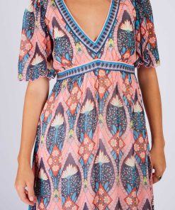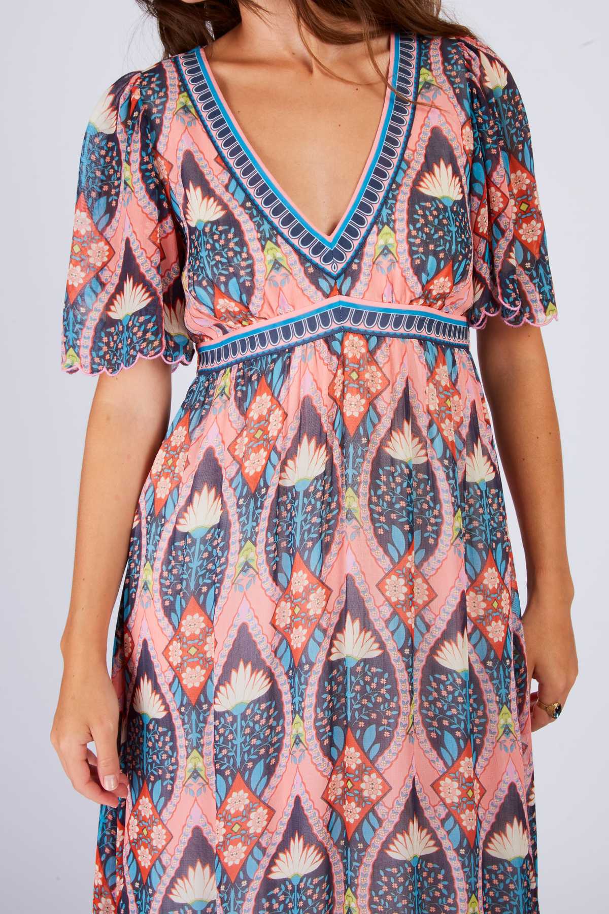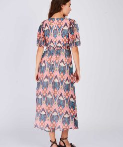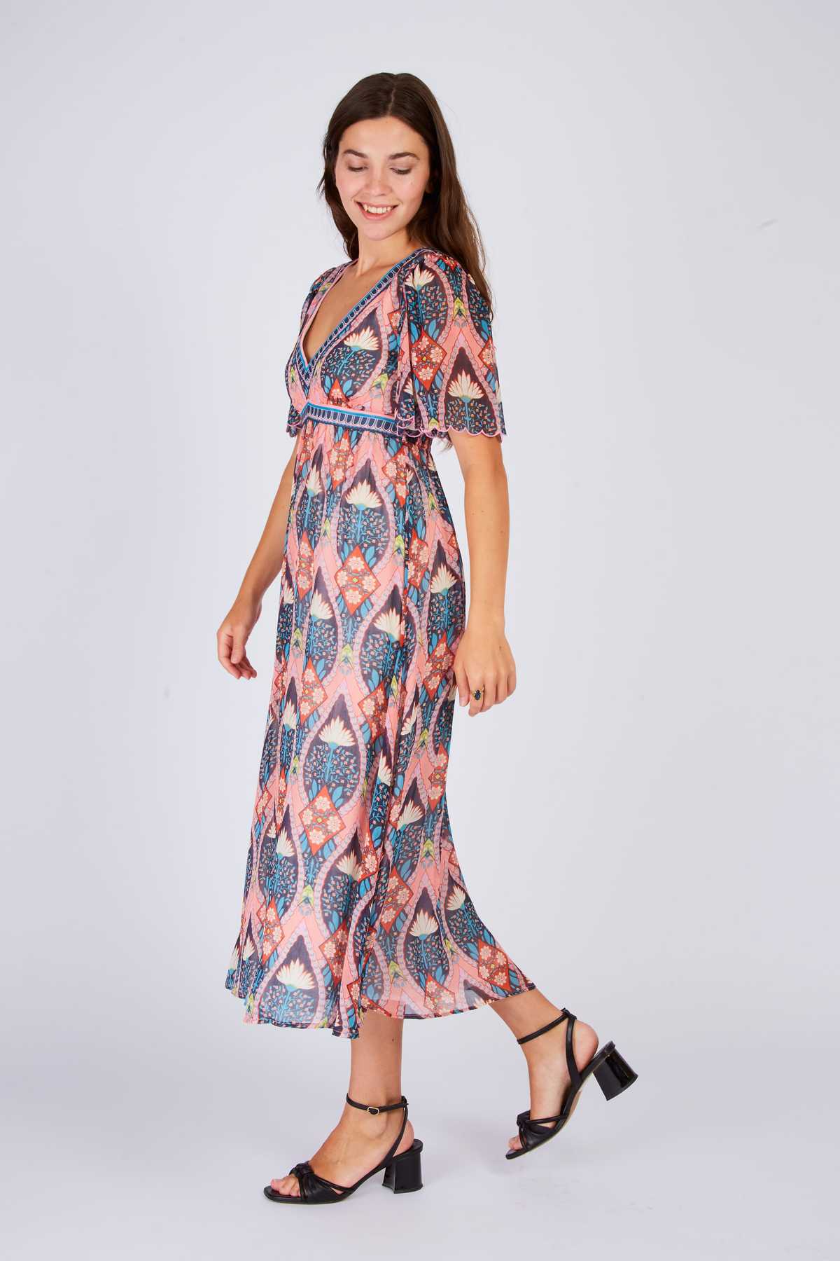 Robe longue. Manches courtes avec volants. Décolleté en V. Imprimé géométrique et floral. Jupe fluide évasée. Taille marquée. Tissu léger et vaporeux idéal pour la saison estivale.