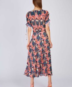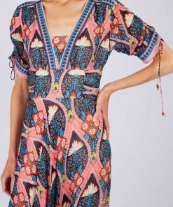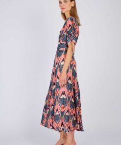 Robe longue. Manches 3/4 avec liens ajustables. Décolleté en V. Imprimé géométrique et floral. Détails de plissés sur le corsage et la jupe. Coupe évasée avec jupe ample et fluide. Cette robe s’accorde parfaitement avec des sandales à talons ou plates pour un look décontracté chic.
