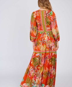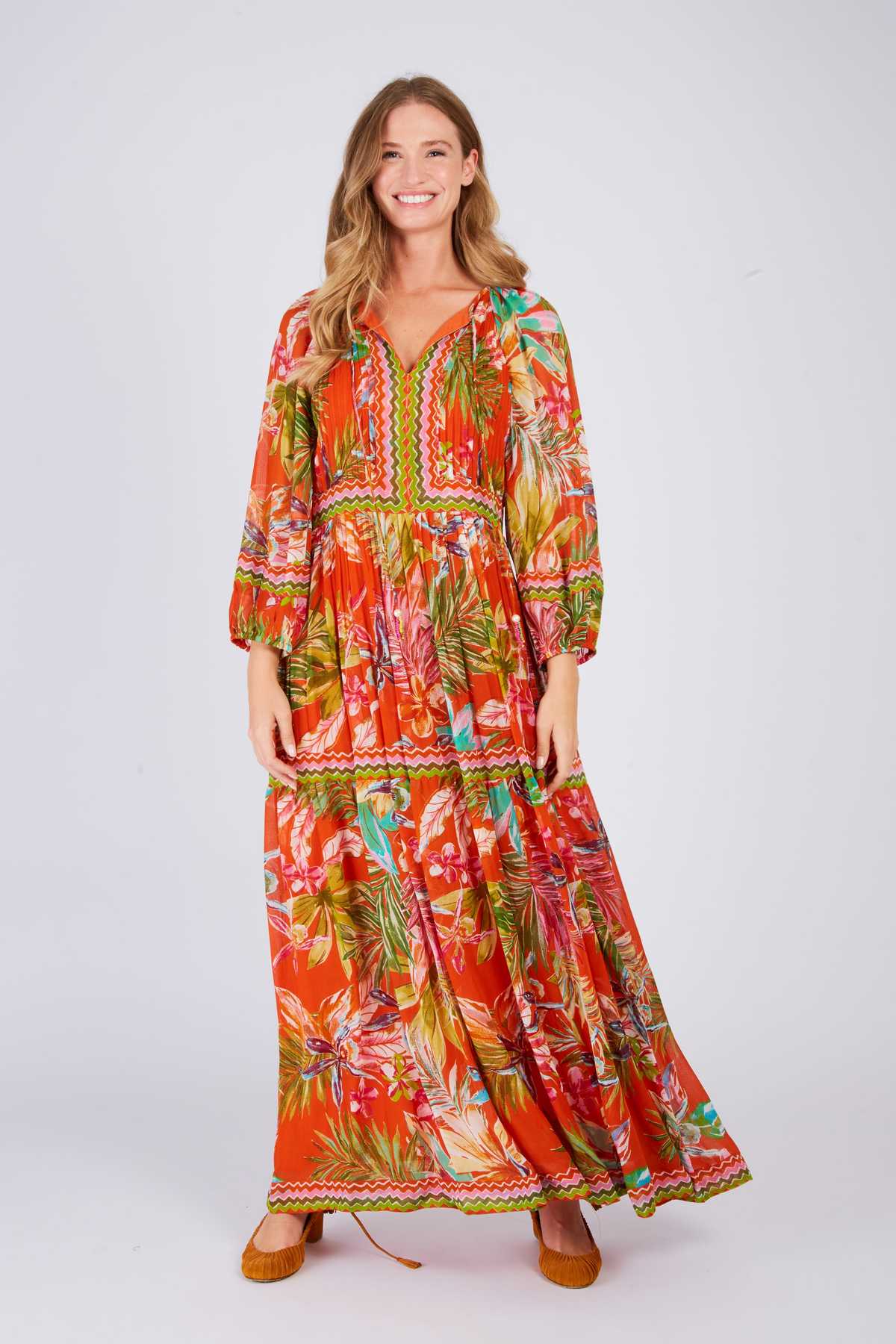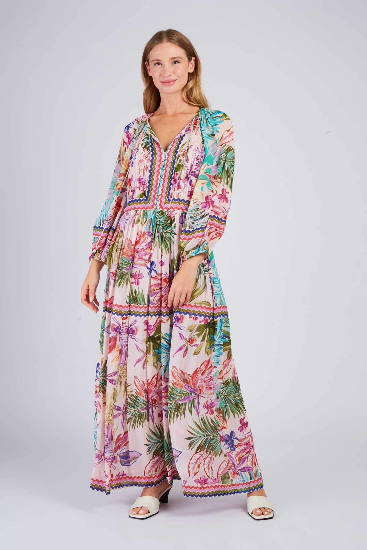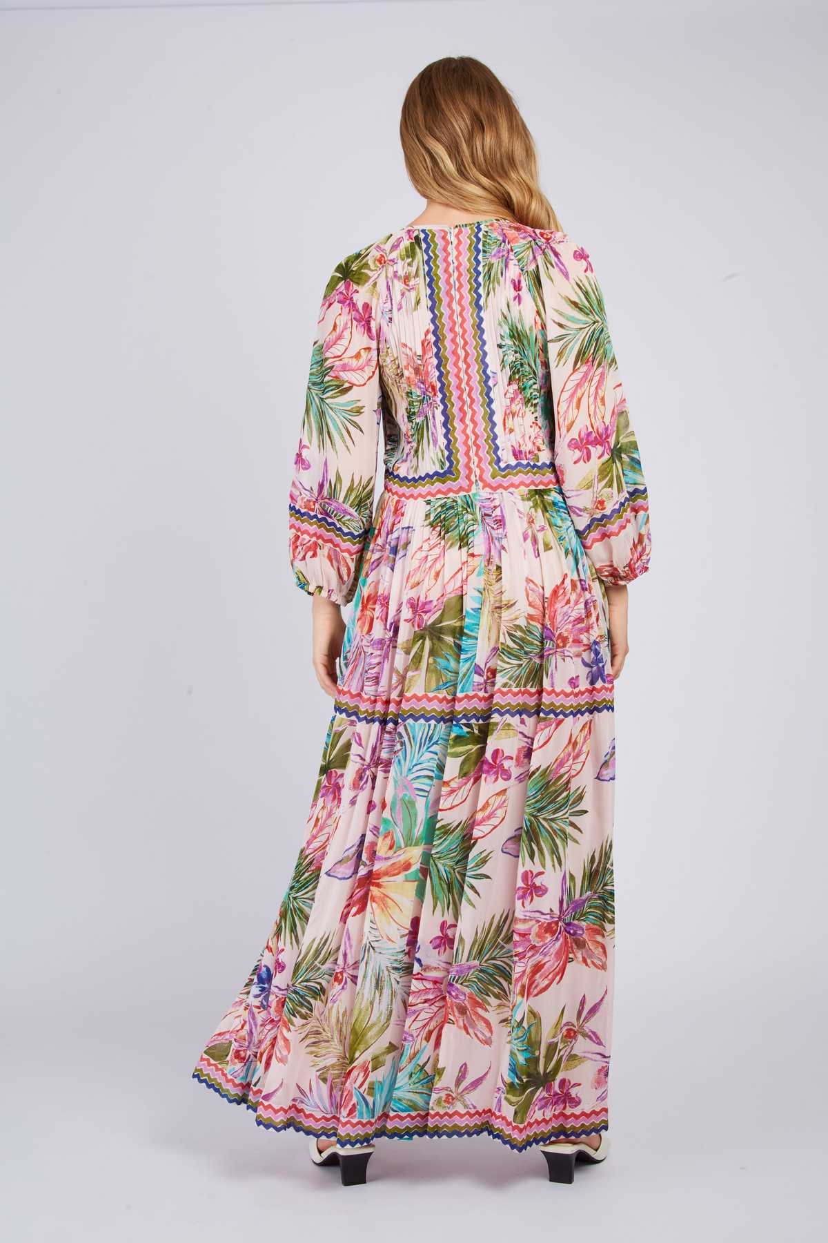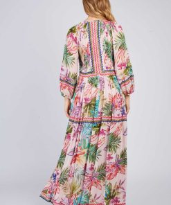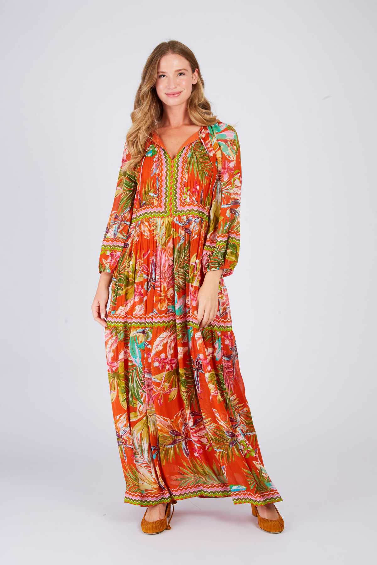 Robe longue bohème à manches longues bouffantes. Décolleté en V. Imprimé floral tropical sur l’ensemble. Taille marquée. Jupe ample à volants étagés. Bordures ornées de galons géométriques. Cette pièce maîtresse apportera une touche de féminité à votre garde-robe.