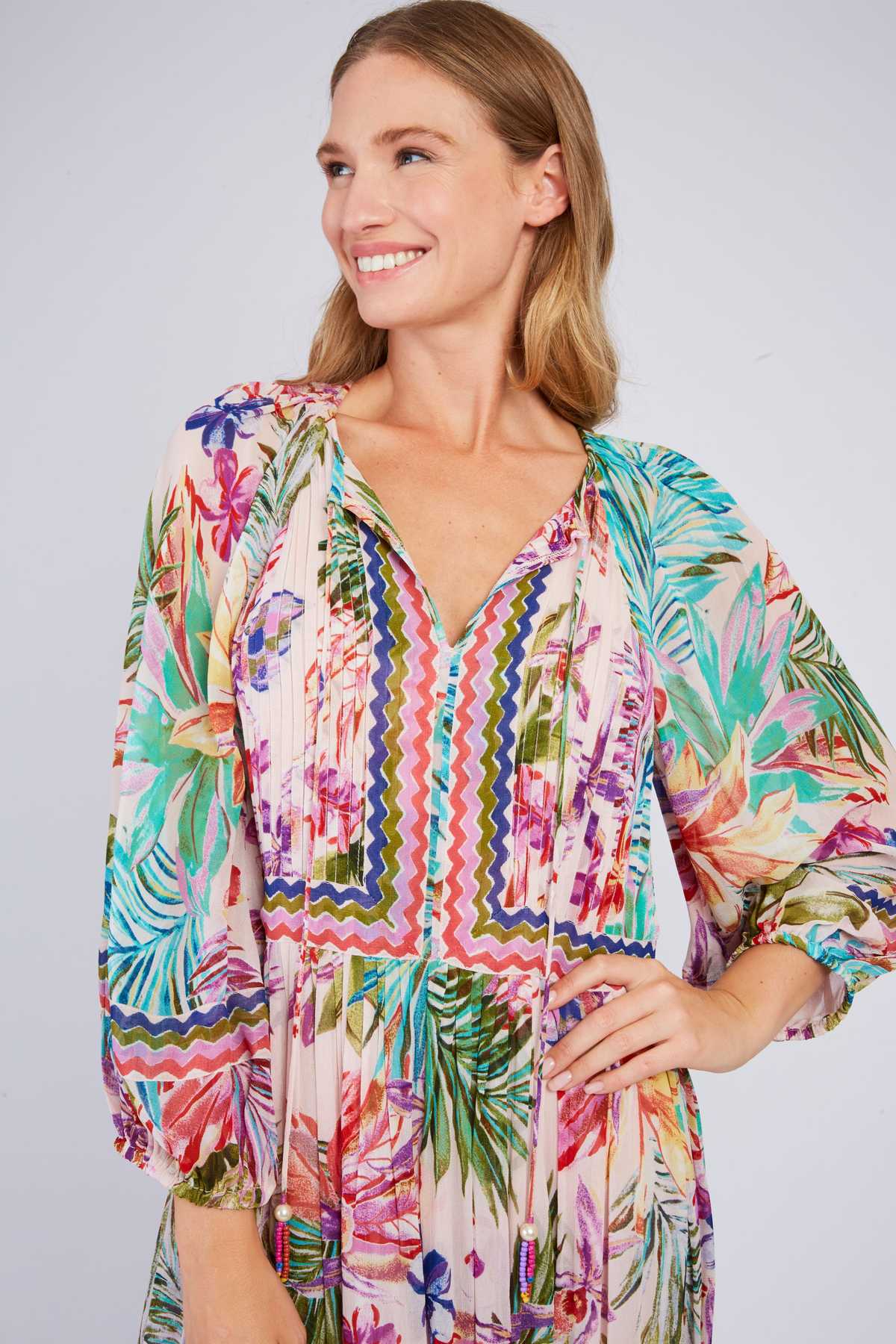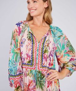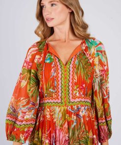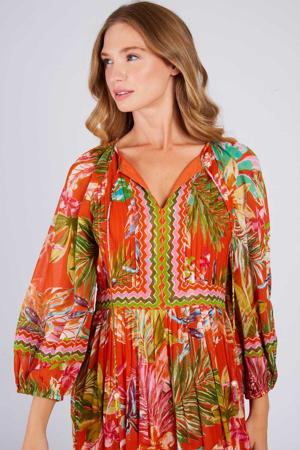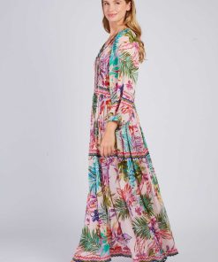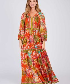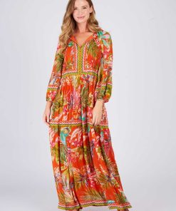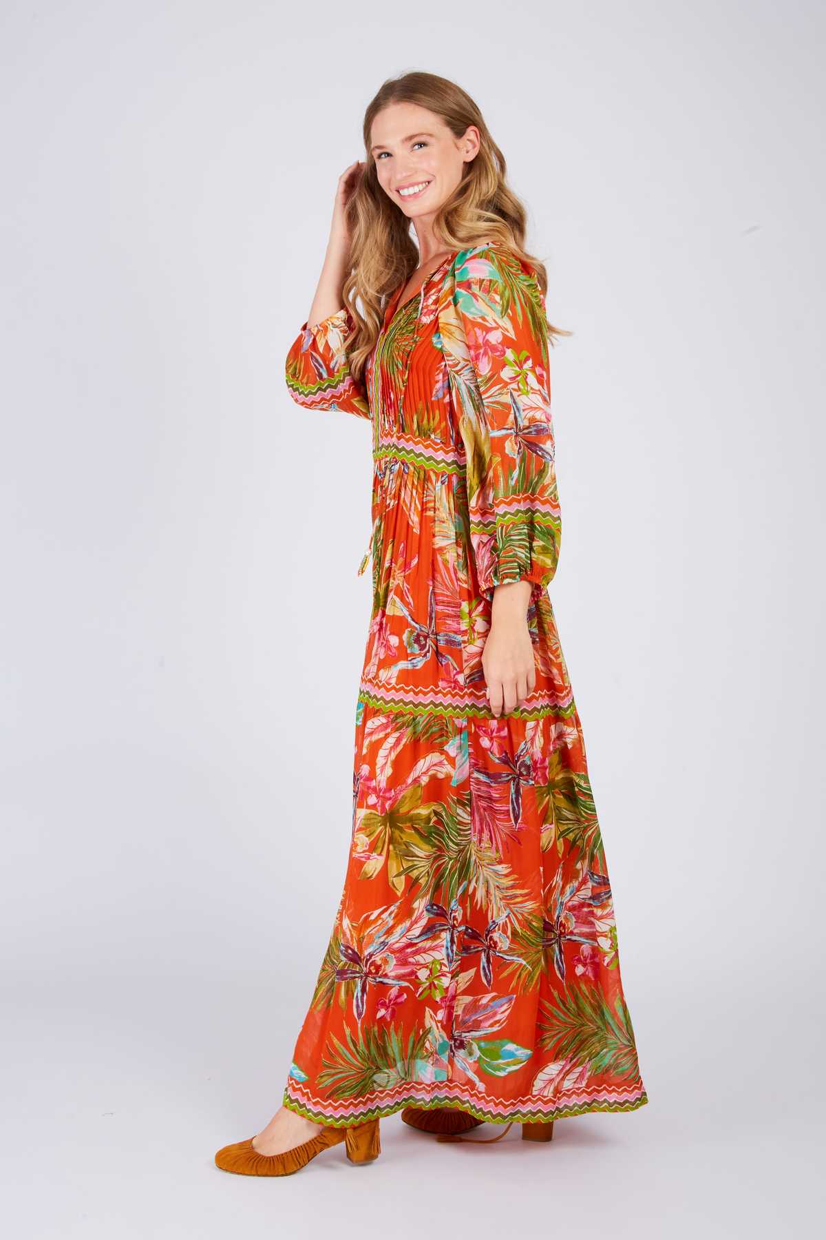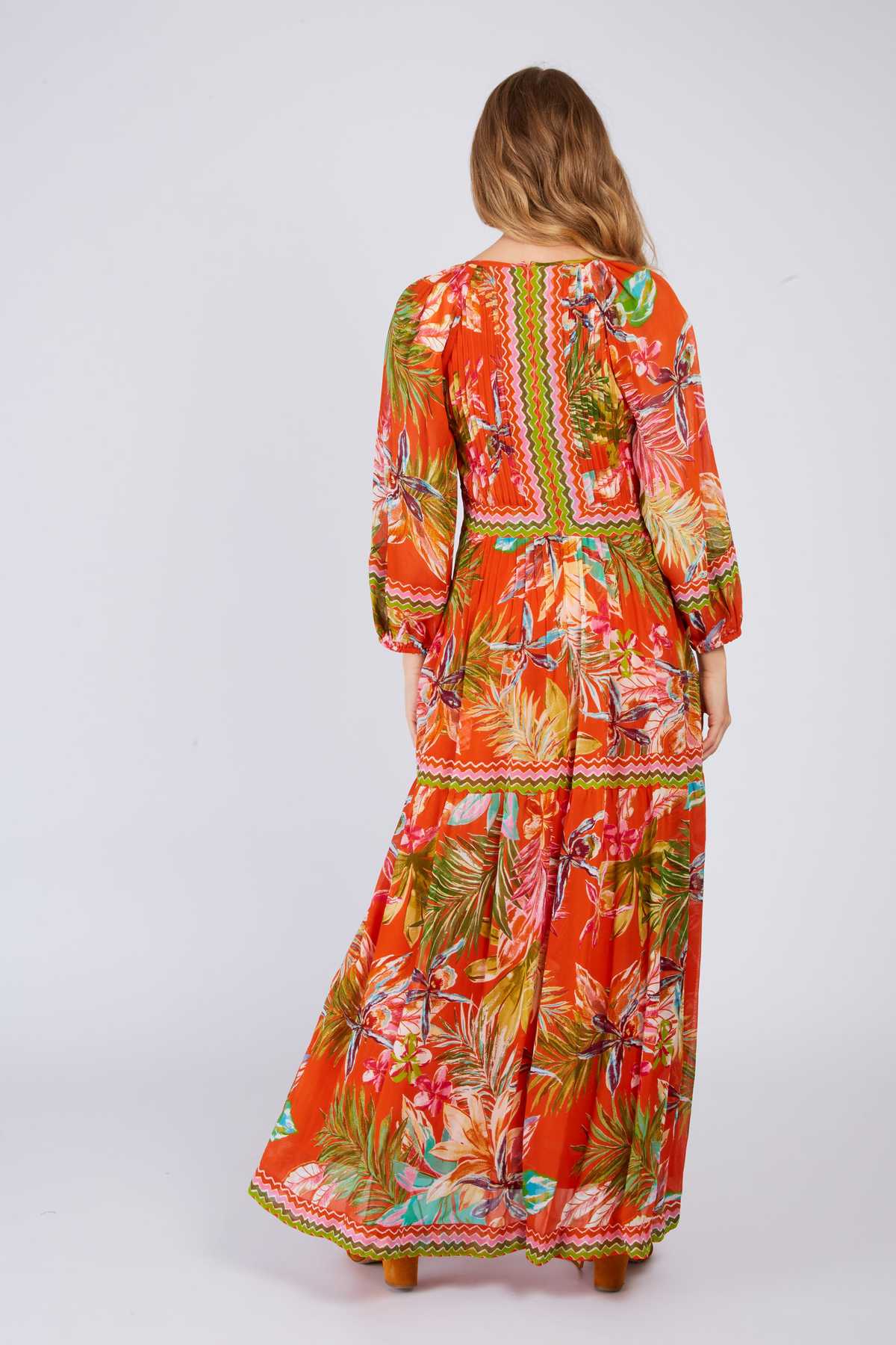 Robe longue bohème à manches longues bouffantes. Décolleté en V. Imprimé floral tropical sur l’ensemble. Taille marquée. Jupe ample à volants étagés. Bordures ornées de galons géométriques. Cette pièce maîtresse apportera une touche de féminité à votre garde-robe.