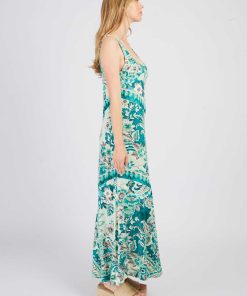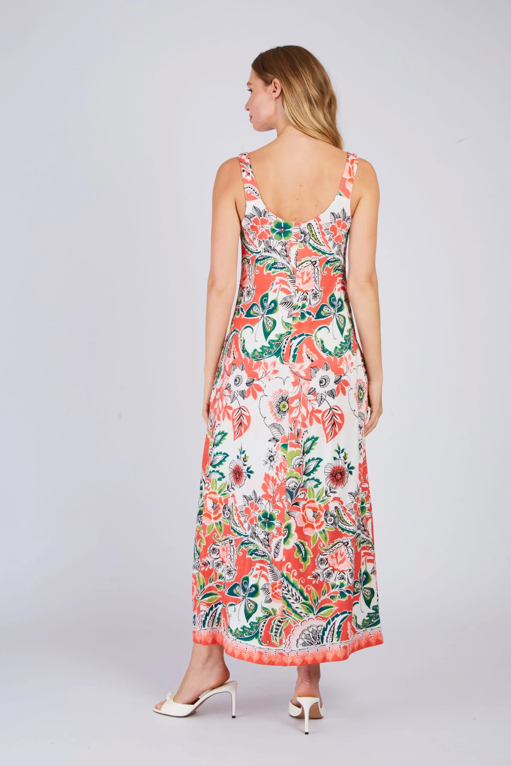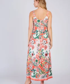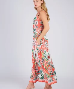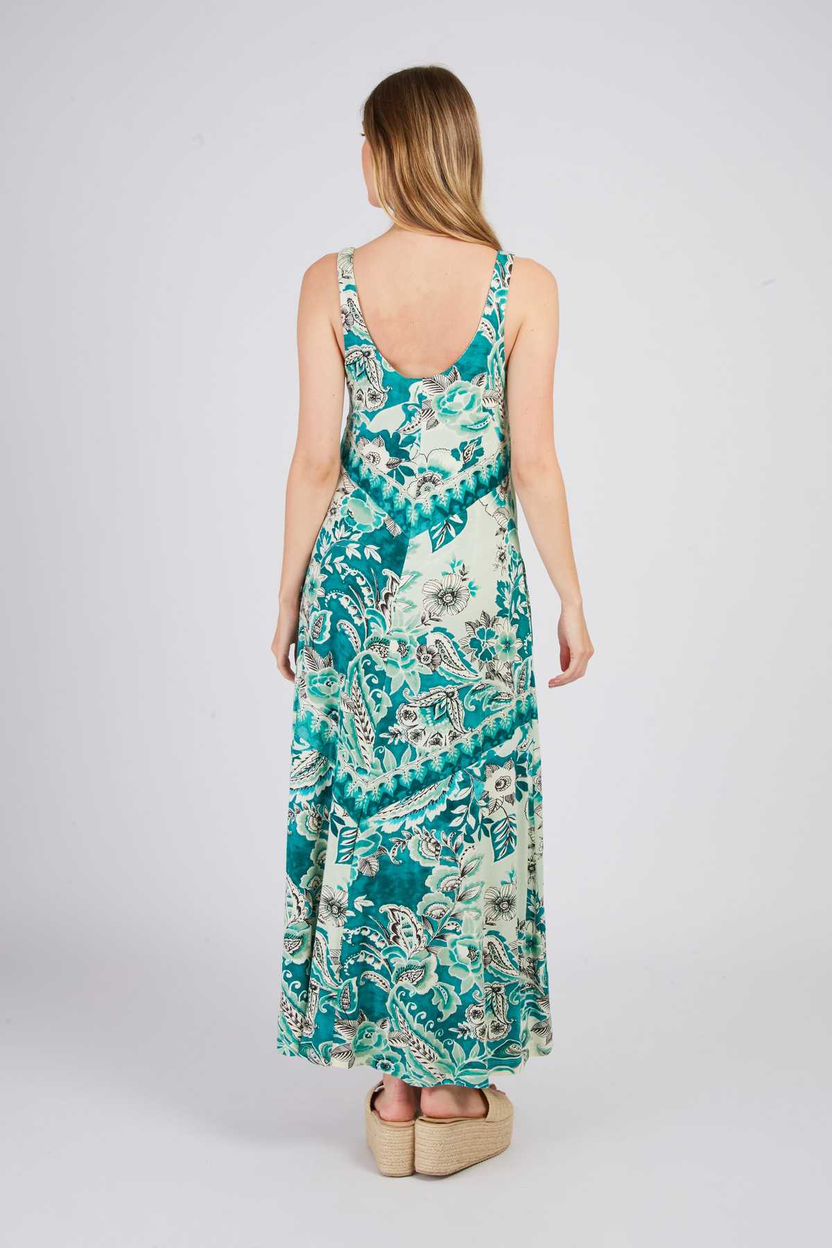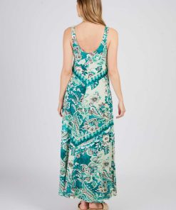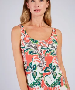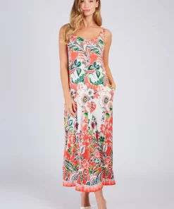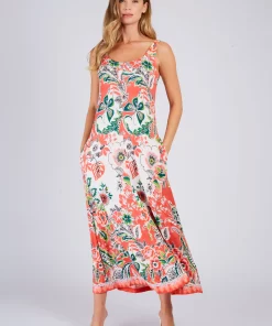 Robe longue maxi à bretelles fines. Décolleté arrondi. Imprimé floral exotique. Motif chevron créant un effet de découpe visuelle sur le buste. Coupe ample et fluide. Tissu léger et aérien, idéal pour une silhouette élancée et un look bohème chic estival.