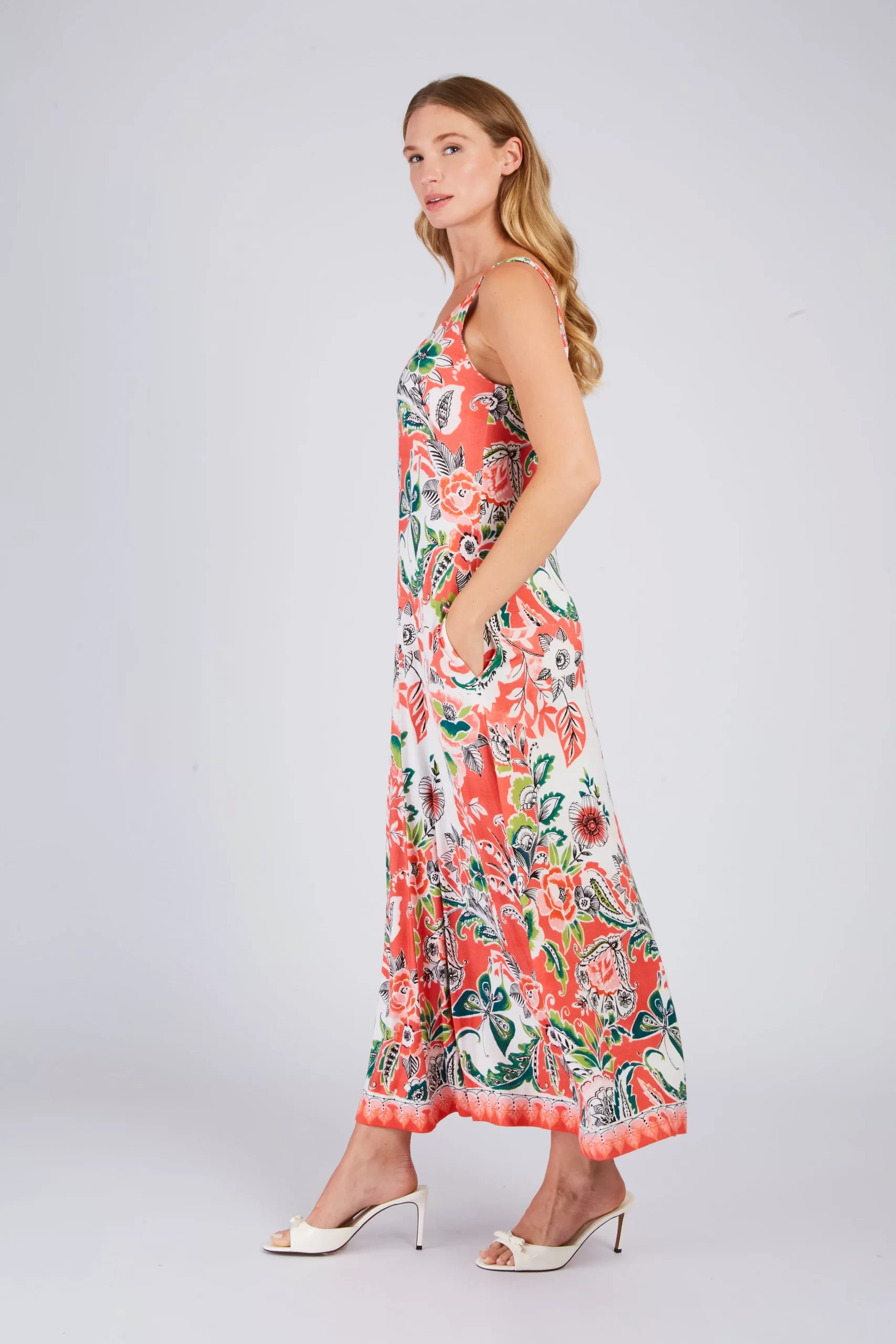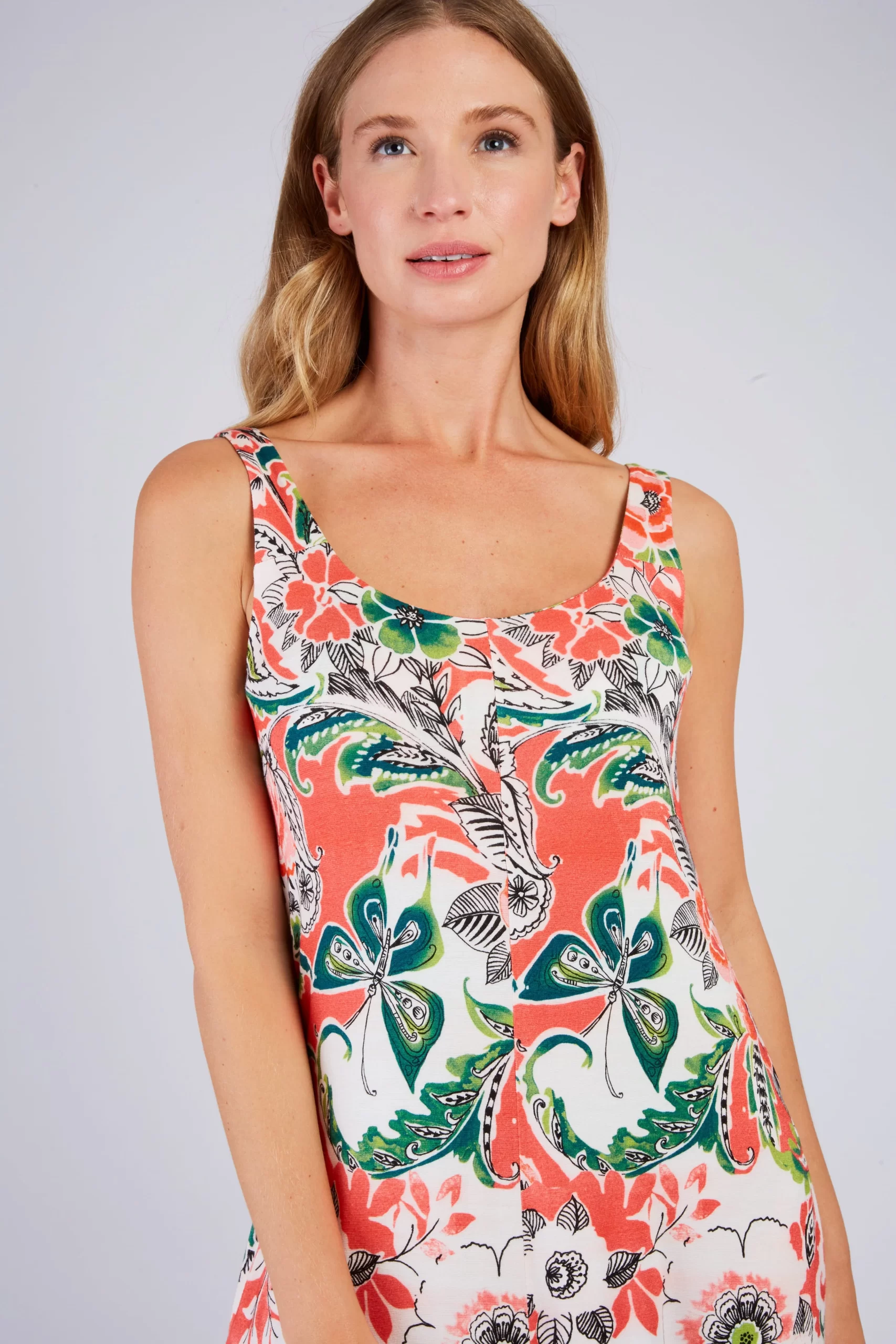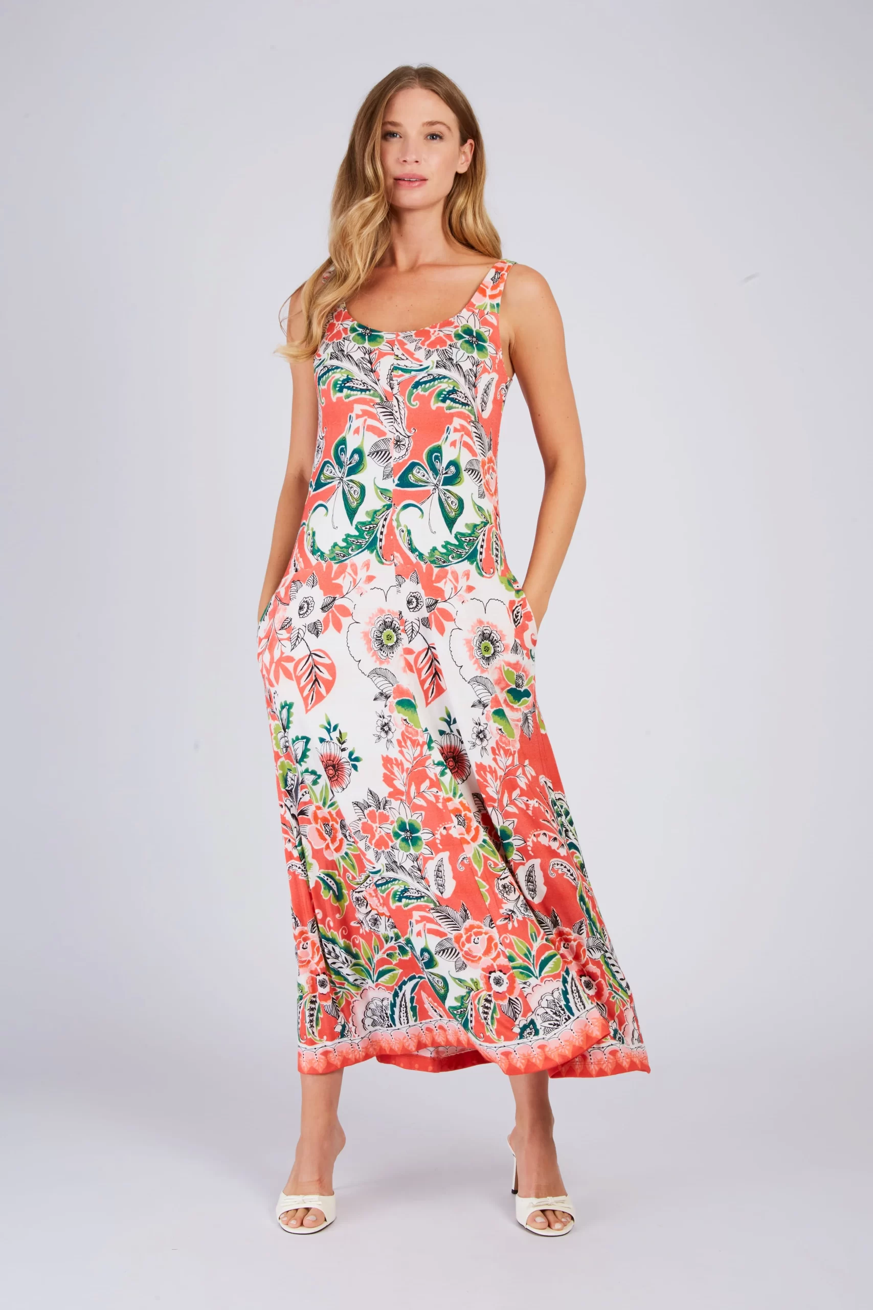 Robe longue maxi à bretelles fines. Décolleté arrondi. Imprimé floral exotique. Motif chevron créant un effet de découpe visuelle sur le buste. Coupe ample et fluide. Tissu léger et aérien, idéal pour une silhouette élancée et un look bohème chic estival.