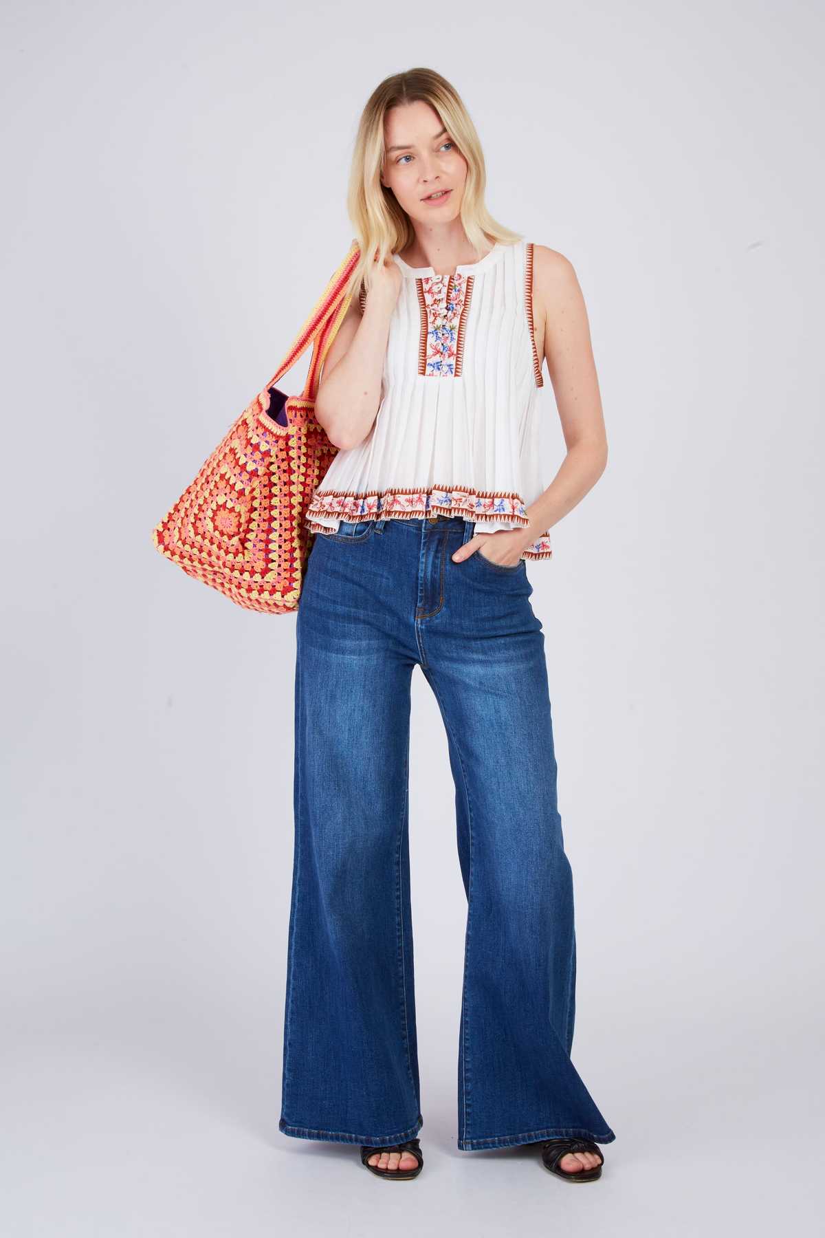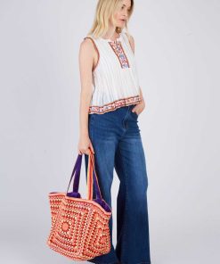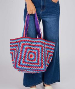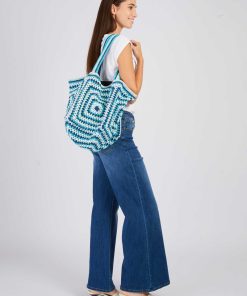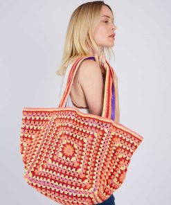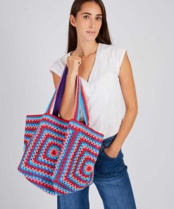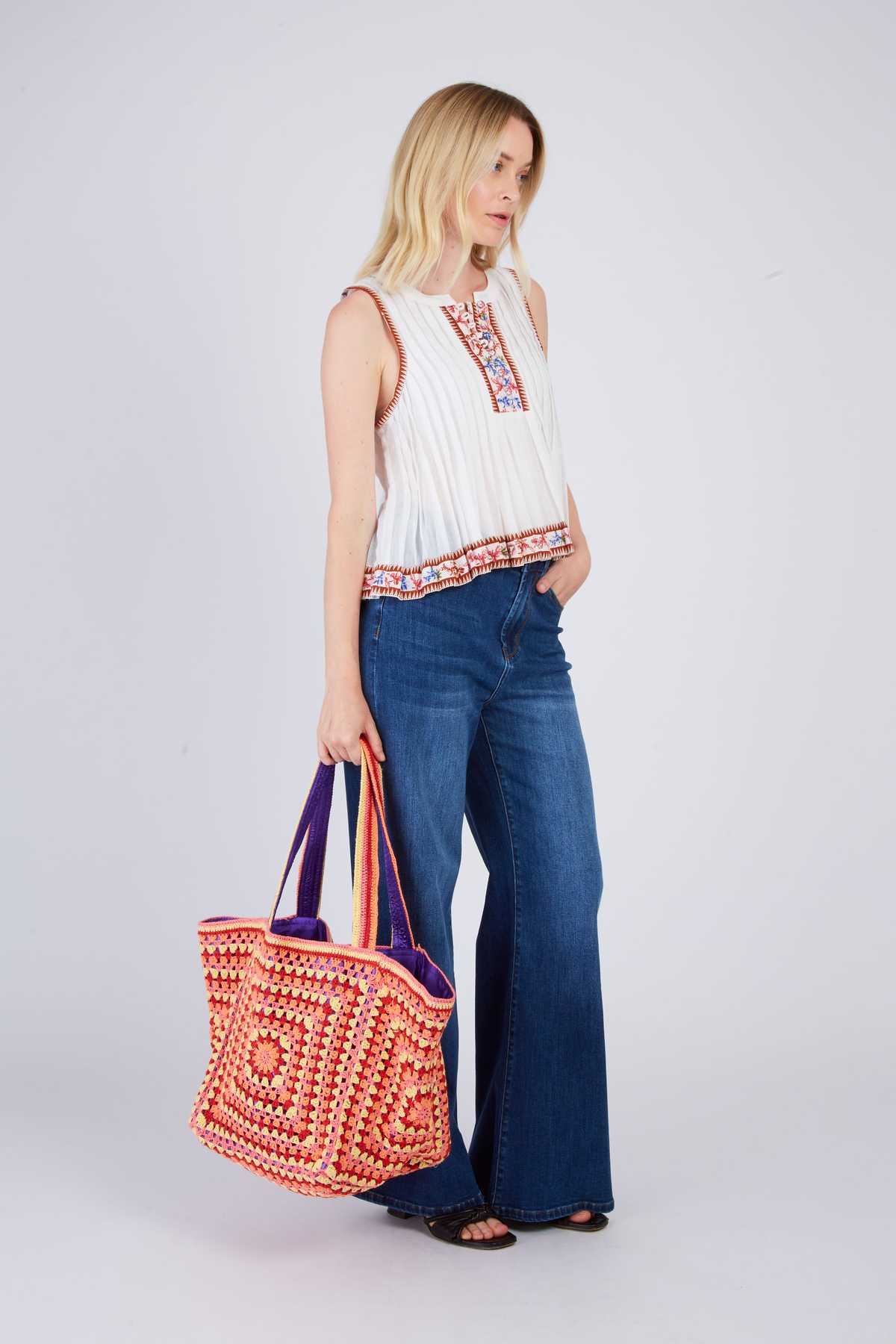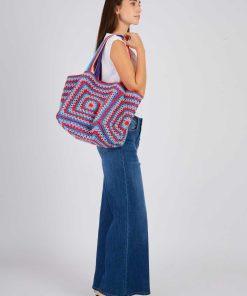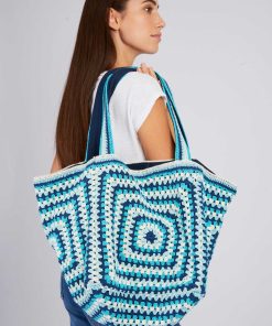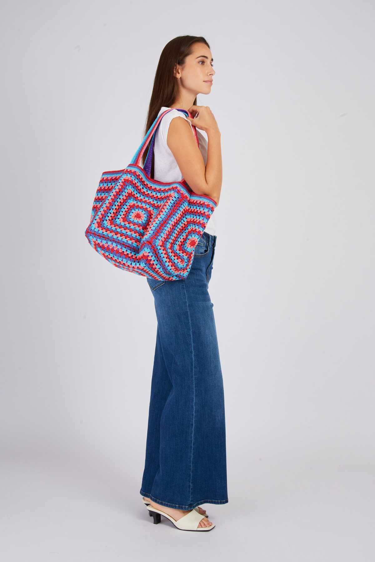 Cabas crocheté de grande taille. Anses doubles intégrées. Motif graphique. Finitions soignées avec bordure contrastante. Accessoire spacieux idéal pour un look bohème chic estival, parfait pour la plage.